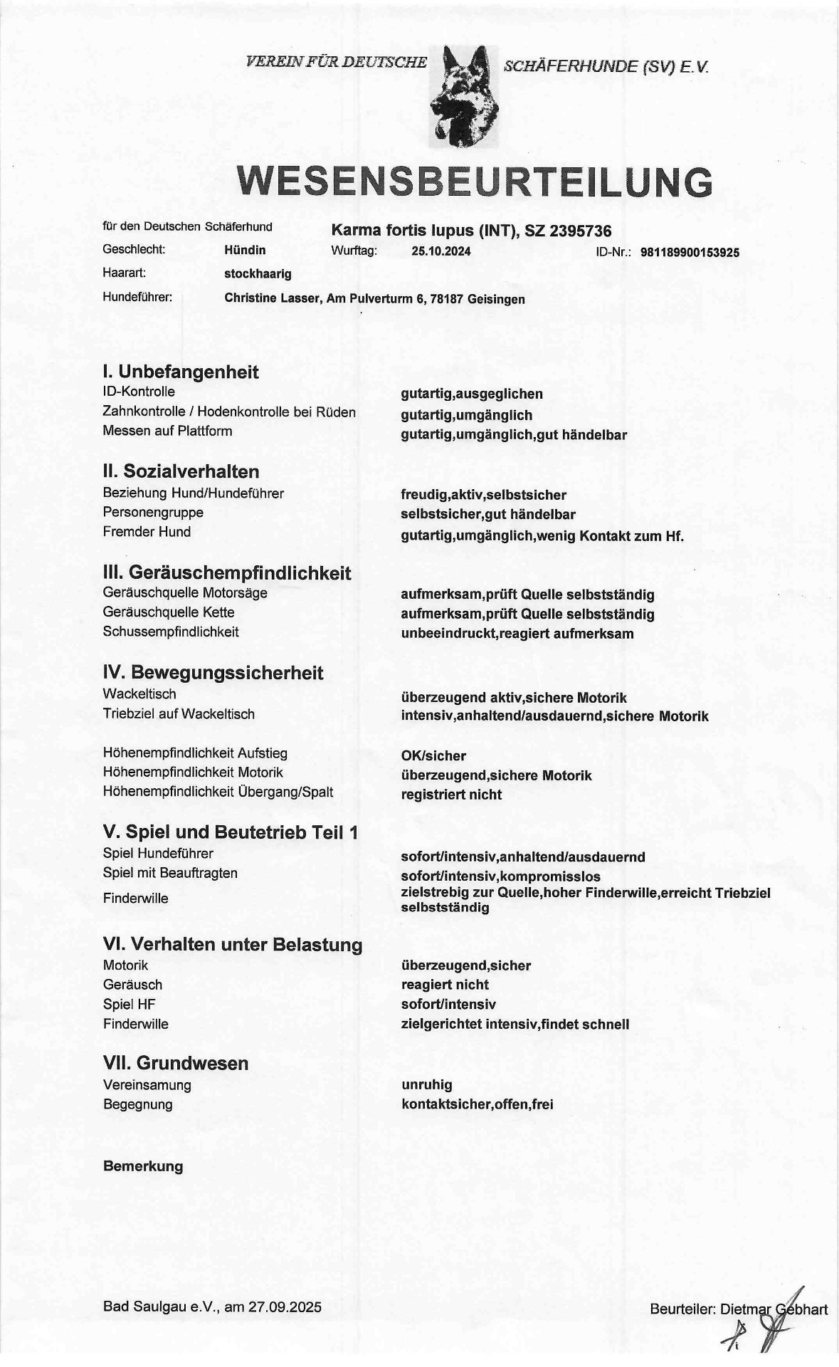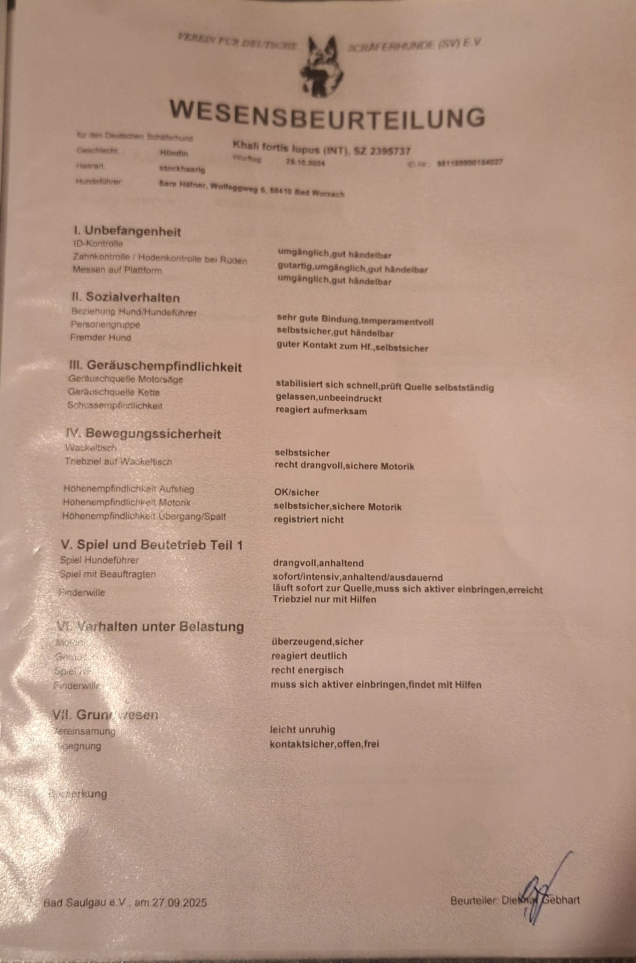 08.07.2023: Heute hat "Hannes" fortis lupus mit 9,5 Monaten seine Wesensbeurteilung in der OG Monheim, bei der Richterin Bärbel Biernath, sehr souverän gemeistert. Herzlichen Glückwunsch Steffi zu der tollen Leistung.