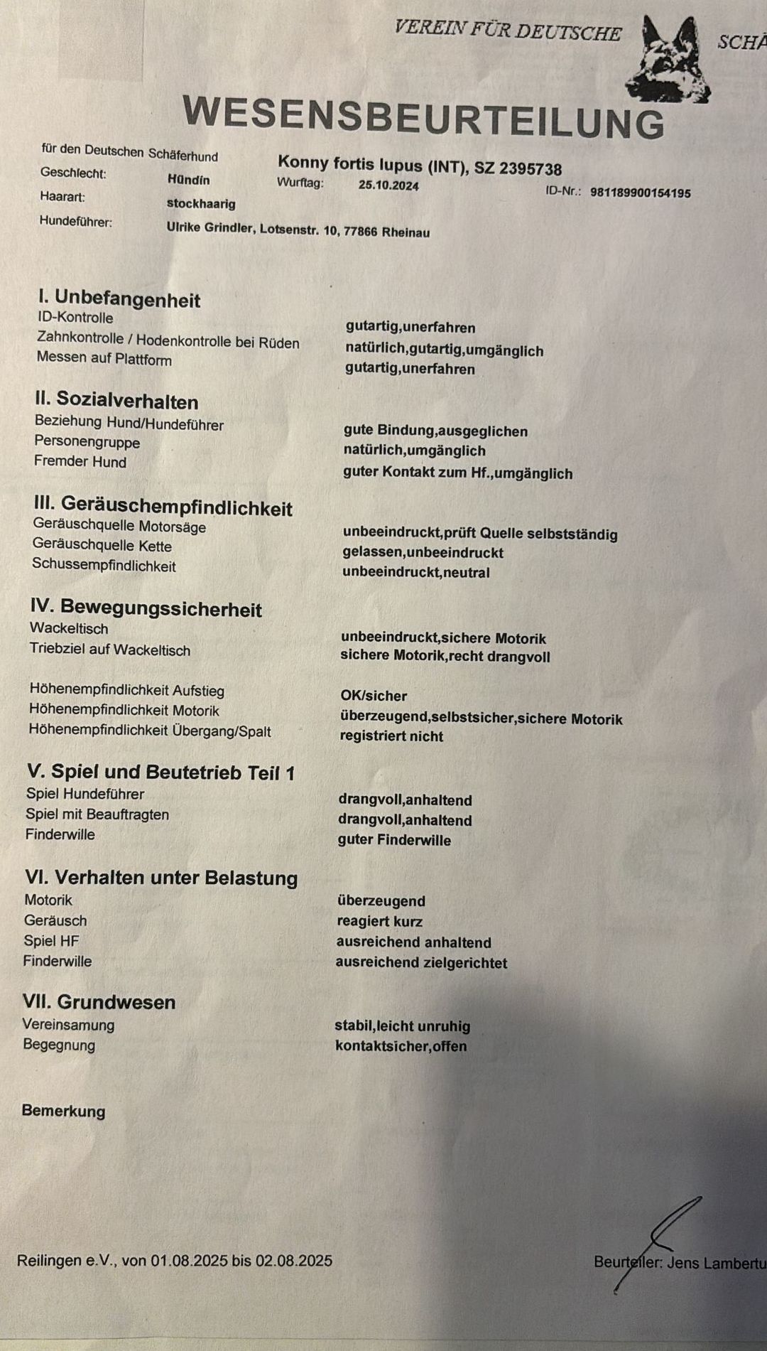 Die Leistung von Ulrike und ihrer "Konny" bei der Wesensbeurteilung am 02. August 2025 zeugt von hervorragender Vorbereitung und Teamarbeit. Ulrike konnte souverän zeigen, dass sie und Konny eine enge Bindung haben und in Stresssituationen ruhig und koordiniert agieren können. Solche Fähigkeiten sind entscheidend, um nicht nur in der Beurteilung zu bestehen, sondern auch um eine erfolgreiche Partnerschaft fördern.